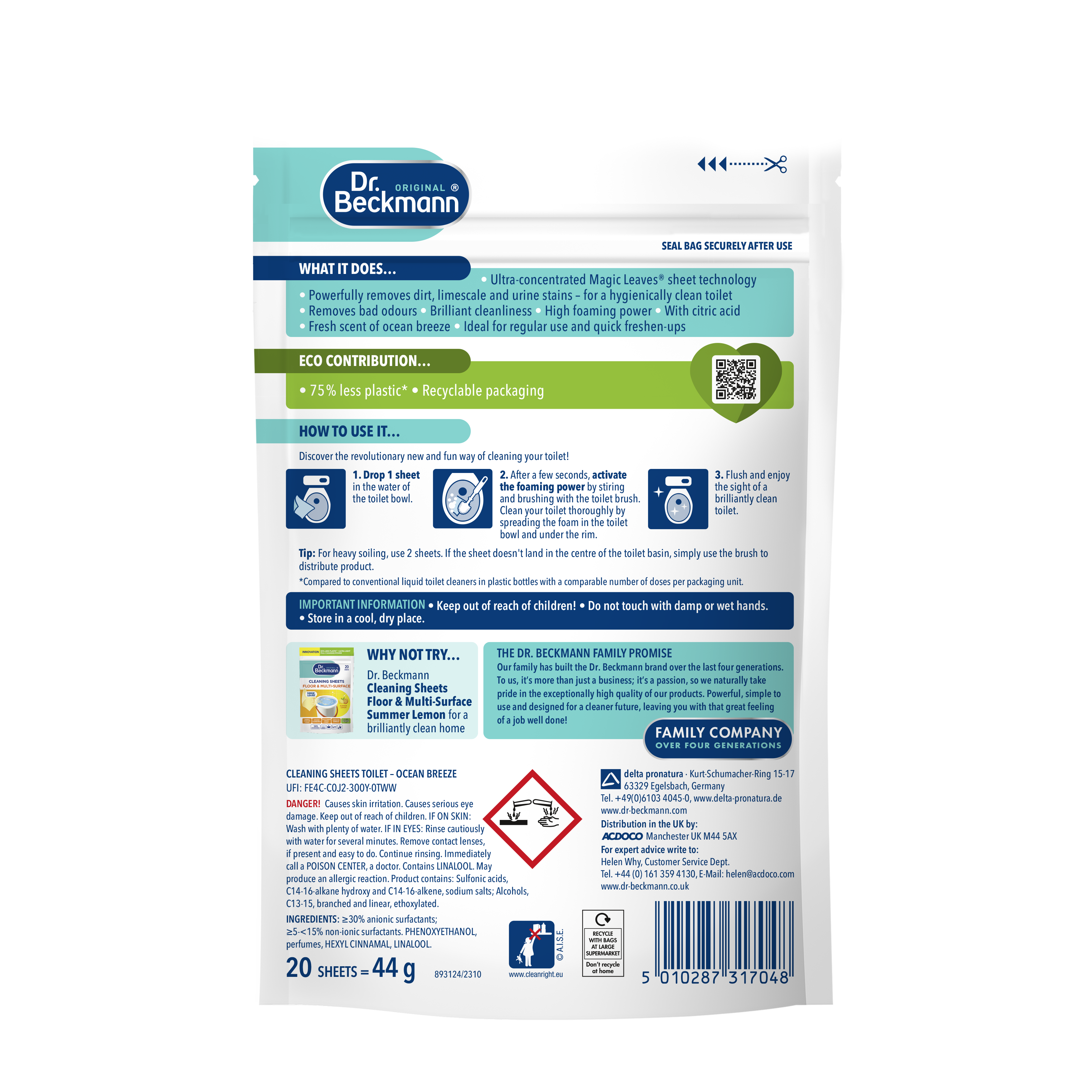 CLEANING sheets TOILET – Ocean Breeze DANGER! Causes skin irritation. Causes serious eye damage. Keep out of reach of children. IF ON SKIN: Wash with plenty of water. IF IN EYES: Rinse cautiously with water for several minutes. Remove contact lenses, if present and easy to do. Continue rinsing. Immediately call a POISON CENTER, a doctor. Contains LINALOOL. May produce an allergic reaction. Product contains: Sulfonic acids, C14-16-alkane hydroxy and C14-16-alkene, sodium salts; Alcohols, C13-15, branched and linear, ethoxylated. INGREDIENTS: ≥30% anionic surfactants; ≥5-<15% non-ionic surfactants. PHENOXYETHANOL, perfumes, HEXYL CINNAMAL, LINALOOL.