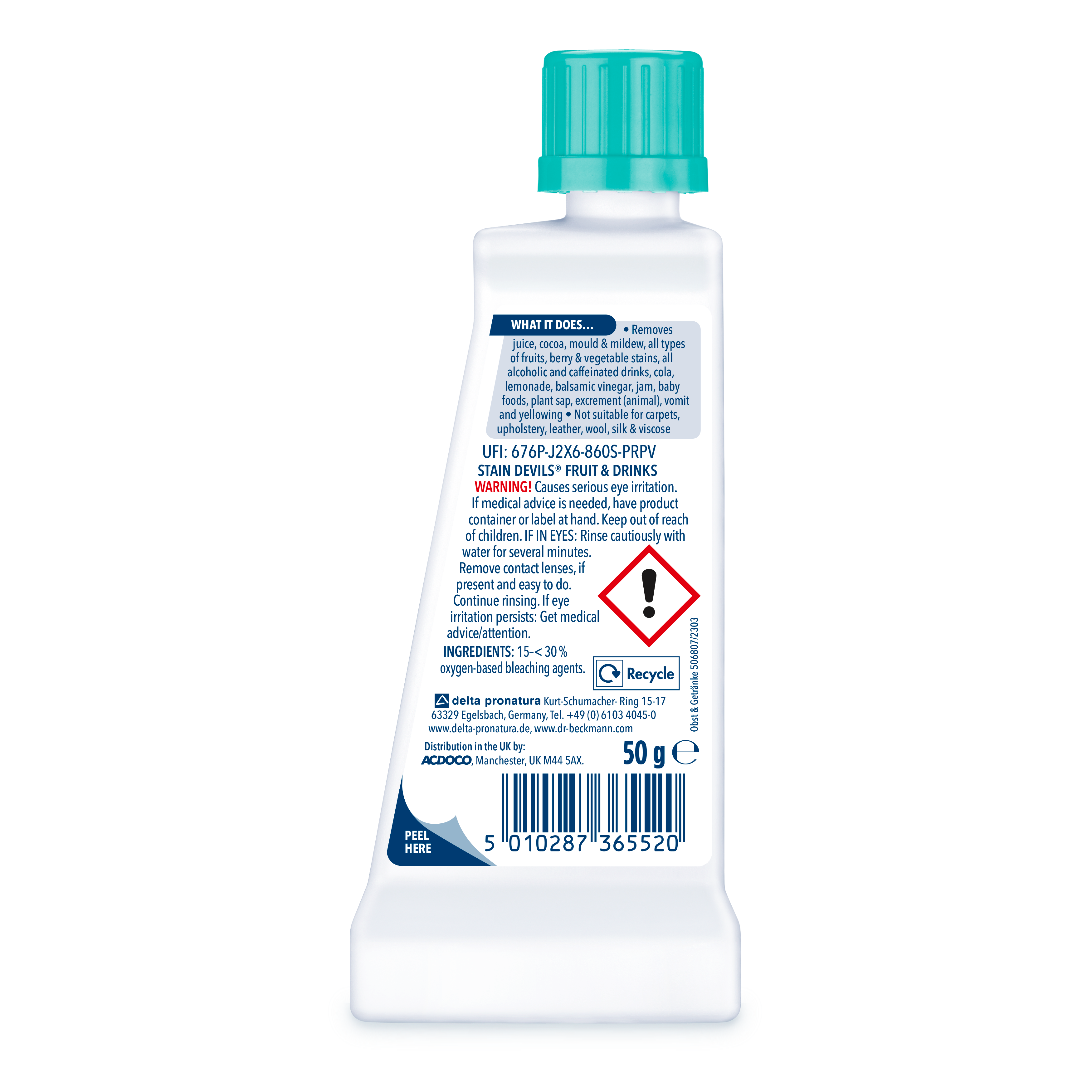 Dr. Beckmann Stain Devils Fruit & Drinks is specially developed with an active-oxygen booster that bleaches and removes the stain effectively in a colour and fabric-friendly manner. Ideal for stains such as; coffee, tea, red wine, fruit juices, jam as well as stains like mildew and mould. Not suitable for: LEATHER, SUEDE, ACETATE/RAYON, CARPETS OR UPHOLSTERY.