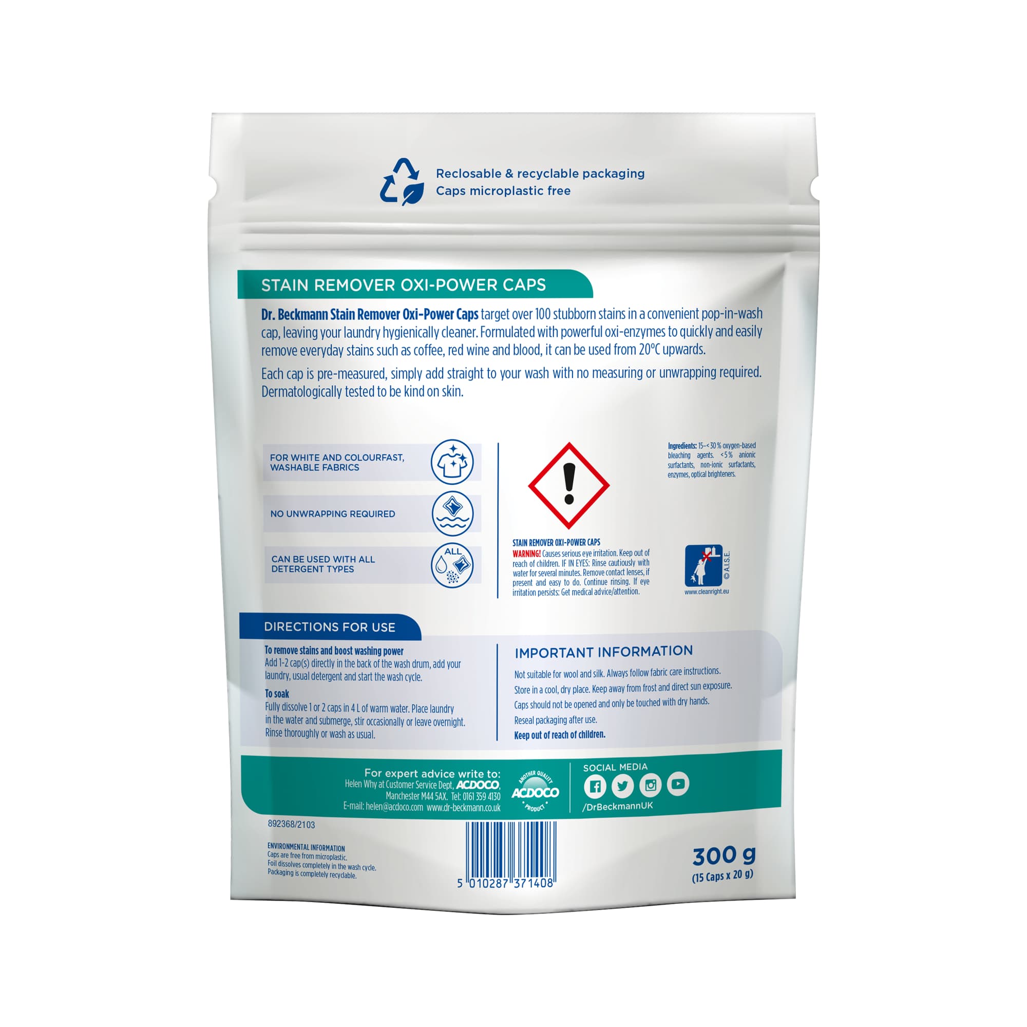 Dr. Beckmann Stain Remover Oxi-Power Caps target over 100 stubborn stains in a convenient pop-in-wash cap, leaving your laundry hygienically cleaner. Formulated with powerful oxi-enzymes to quickly and easily remove everyday stains such as coffee, red wine and blood, it can be used from 20°C upwards. Each cap is pre-measured, simply add straight to your wash with no measuring or unwrapping required. Dermatologically tested to be kind on skin.