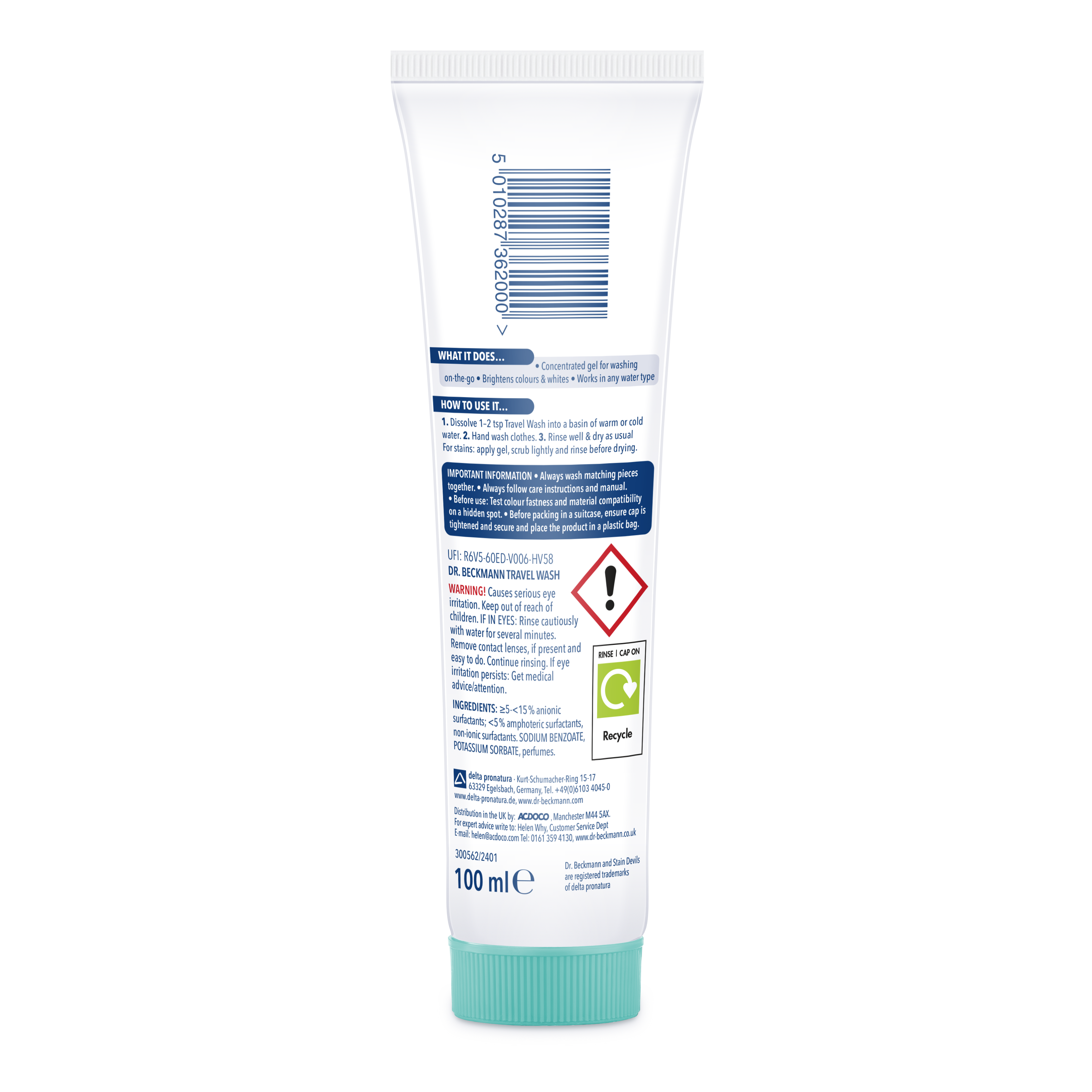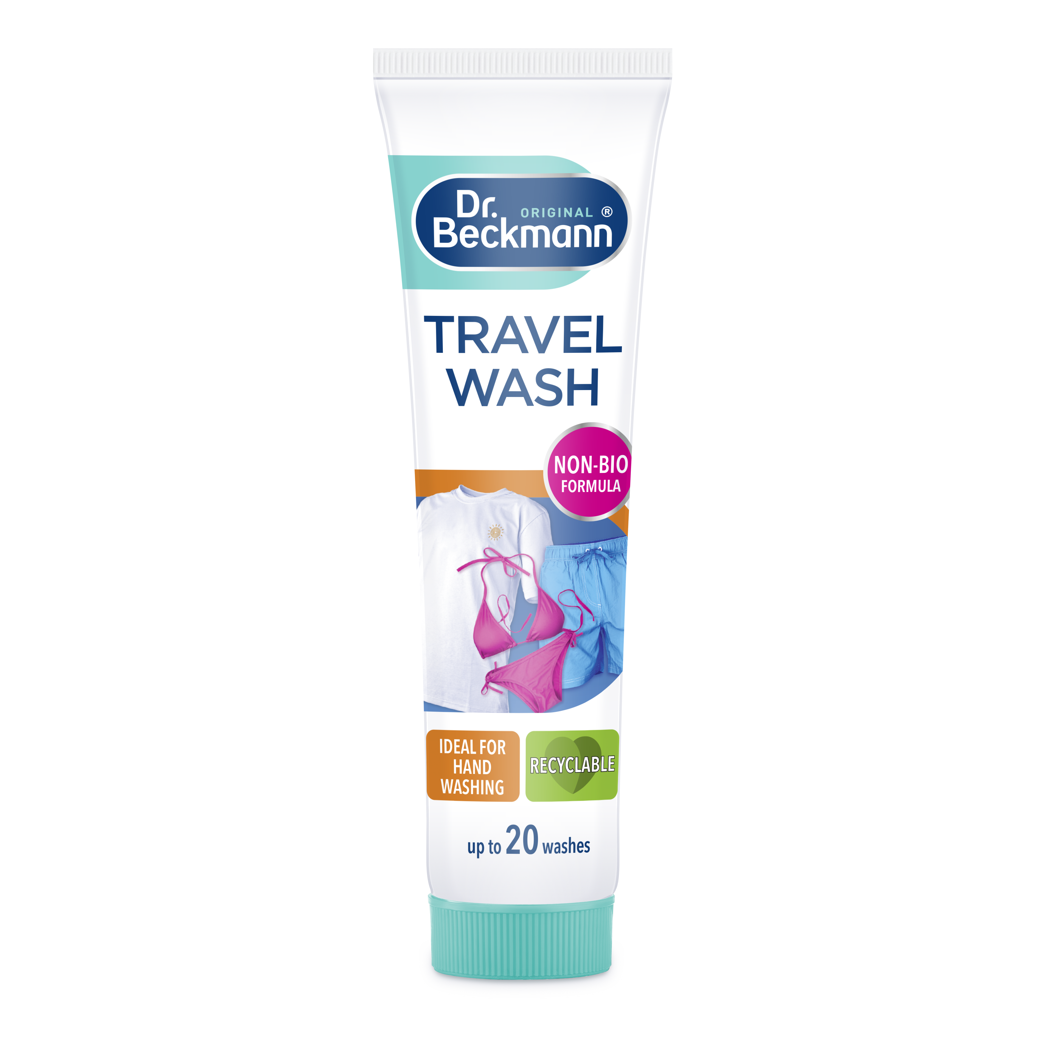 Dr. Beckmann Travel Wash is a concentrated gel for general garment washing and spot stain removal. It’s ideal for on-the-go washing when away from home. The Non-bio formula is suitable for all types of washable and colourfast fabrics and each tube provides up to 20 hand washes. Travel Wash makes the perfect travel companion for weekends away or even holidays further afield. Wash your clothes anytime, anywhere!